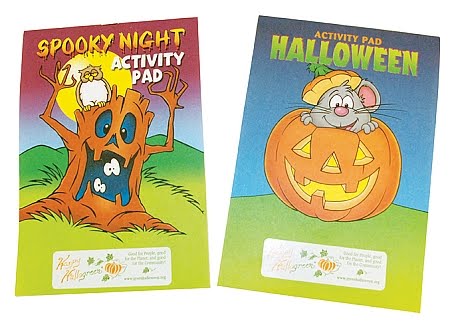 This year I got the idea to hand out recycled treats. I found Weisenbach Recycled Products and their Green Halloween products are really cool. You can buy Halloween Activity Pads, Soy Bean Crayons, Hand Fan Masks, Picture Me Green Books, Pumpkin Tattoos, Pencils and more! They are sold in bulk packs at great prices. I really liked the Halloween Activity Pads with Soy Bean Crayons.