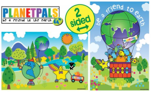 CEACO created a 24 piece doubled sided floor puzzle that is 2X3 feet! It is also made with 90% recycled materials and vegetable based inks. One of the sides has the Planetpals characters riding in a hot air balloon and the other side has the Planetpals nature park with Earthman, Sunnyray and Starbright.