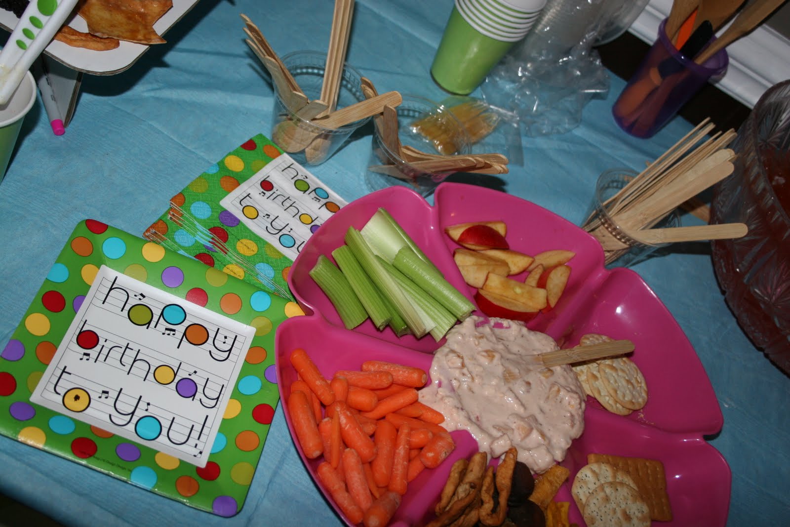 I couldn’t have been more happy with Green Party Goods supplies. They were stylish, fun, safe, and durable. I loved the bamboo utensils and think they are much better than any plastic knife I’ve ever used. The knife wasn’t sharp to the touch but could cut through an apple! I also loved that the beeswax candles didn’t drip as fast as regular wax candles and didn’t end up in Ella’s cake. (BTW- totally forgot to take pics of that. But will on Tuesday when she has her real b-day cake!) The paper tablecloth feels like cloth and doesn’t tear like the normal paper tablecloths. I’m even thinking about keep it on my craft table! And the best part was rounding up all of the cornware cups to compost!