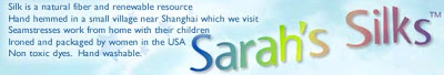 All of Sarah’s Silks are hand hemmed in a small village near Shanghai which the store owners visit. Seamstresses usually work from their homes in their doorways so they can watch their children play. This beats being in a factory any day! Many of Sarah’s Silk products are also sewn, ironed, and assembled in Sonoma County, CA. All of the dyes used on the silks are non-toxic and are easily hand washed.
