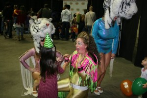 We got to go to the VIP party afterwards and again, I highly recommend getting this package! The food spread was amazing with organic Plum fruit smashes and Revolution Foods. Not to mention tons of fruit, sandwiches, cheeses, and more. The tables had coloring pages and birthday hats. Leslie Hall came out to dance with the kids. Ella gave her a silly band and made her day.