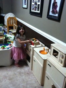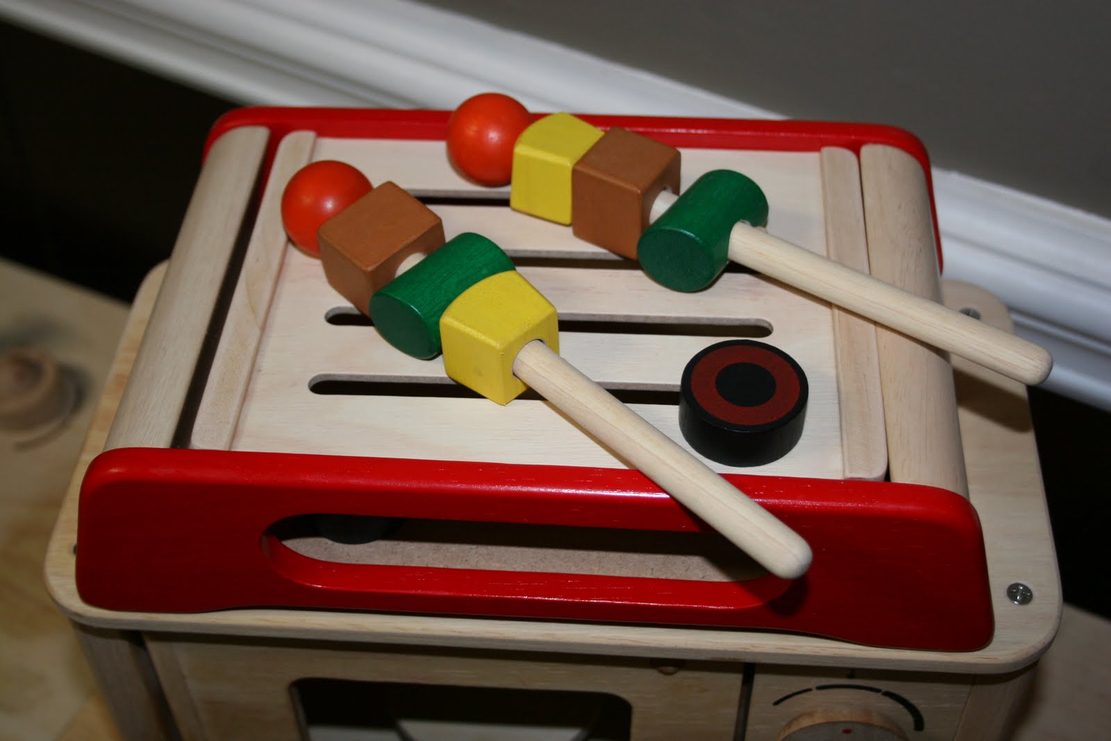 The BBQ Grill is an adorable accessory to the kitchen set. I love the wooden coals that go under the grill! The set comes with block shaped food that attaches to the 2 wooden BBQ sticks, 3 coals, and a tong for coal insertion. It is small, so it’s very easy to store when not in use. We put it on top of the PlanToys stove when in use and store on the mircowave.