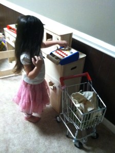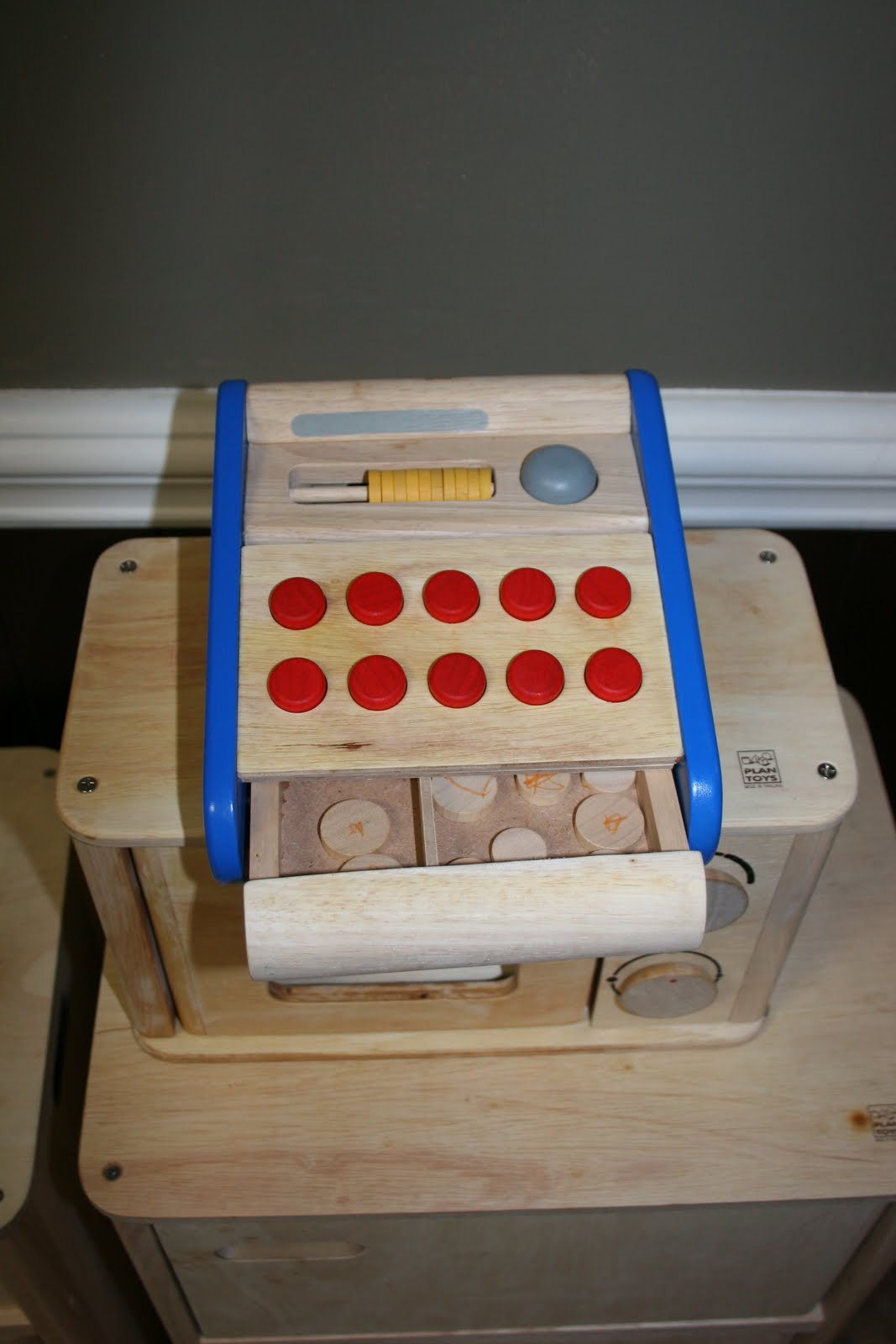 The Cash Register comes with 10 wooden “coins” that fit into the working pop out drawer. There is also a abacus at the top of the cash register to help count the coins. The silver button pops open the drawer to add or take out coins. Once the drawer opens a bell sound is made. This is a great little toy to have around when playing market. Ella loves to “charge me” for our tea parties now.