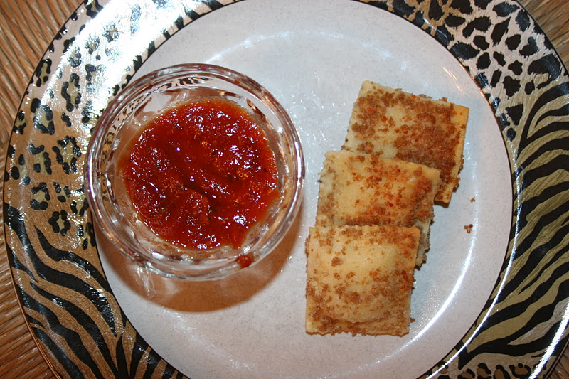 Tomato sauce, tomato paste, italian seasoning, garlic, 1 tbs coconut oil. Ravioli, rolled in coconut flour & panko fried in coconut oil.