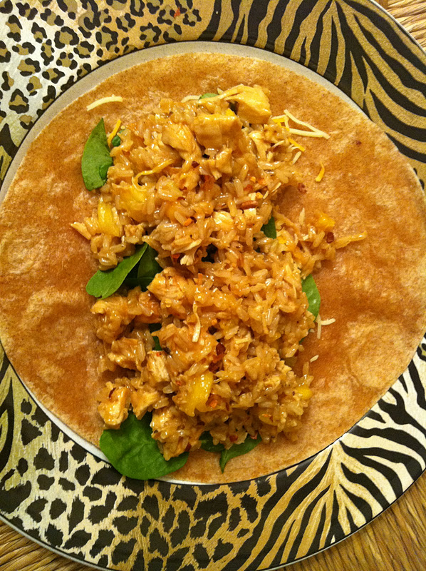 Chicken, pineapple, coconut oil, soy, red pepper, spinach, cheese, in a whole wheat tort