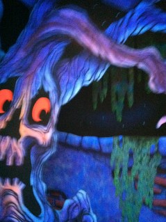 Throughout Carowinds, there are skeletons and other Halloween decor. The super scary stuff that is saved for Scarowinds was closed down so the kiddos couldn’t see. But there were some graveyards, broken skeletons, ghosts, grim reapers, and creepy clowns- which were very frightening to me! (I am terrified of clowns.) There was also a Boo Blast ride where you have a “boo blaster” to aim and shoot the ghosts which wasn’t very scary. E laughed and said it was like Ghost Busters.