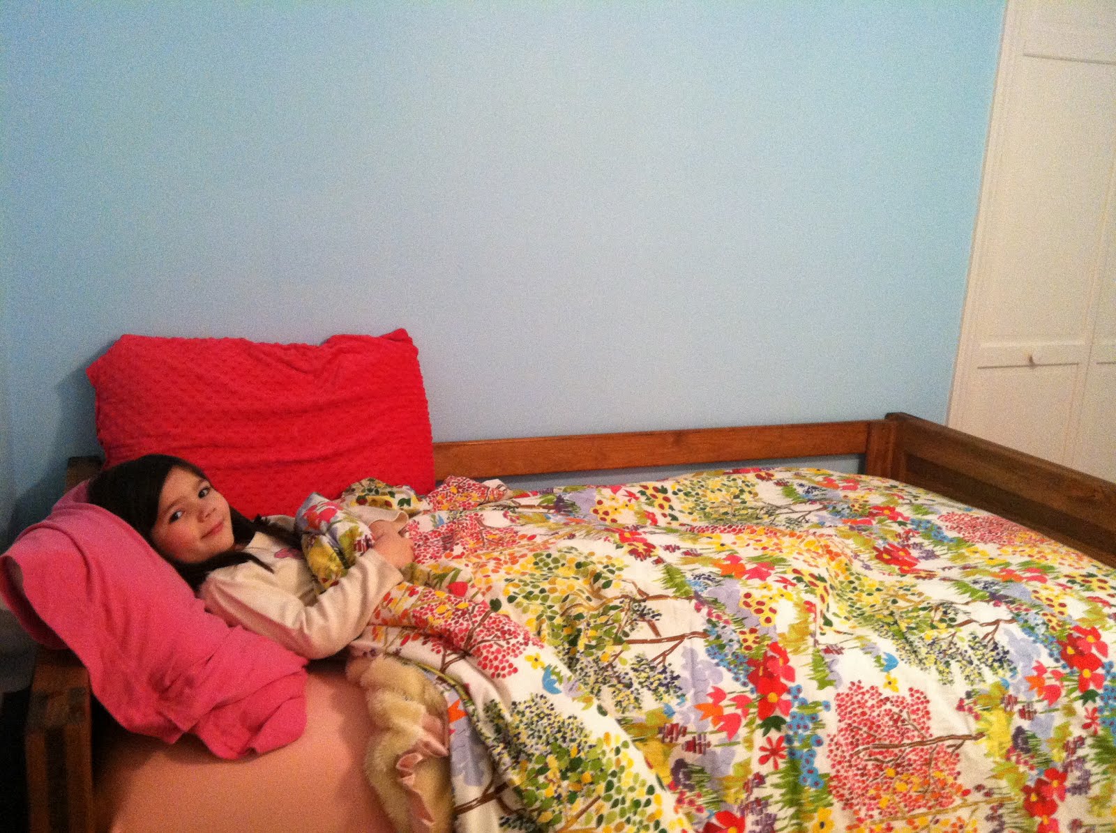 I decided to paint the guest room and turn it into her room before her 5th b-day. During the painting process, I put her bed in my room to transition the move- thanks to advice from Shari Criso. The weekend before E’s birthday, she slept alone in her newly painted room and has been there almost a month now!