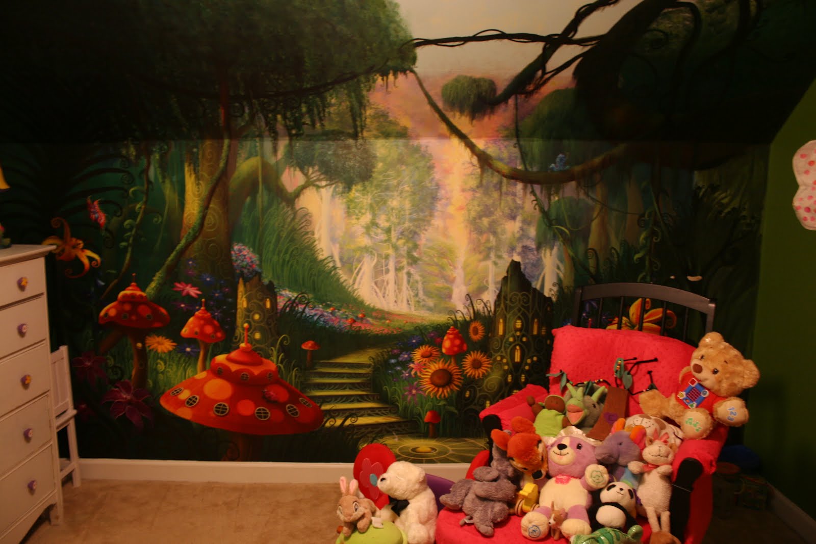 When we moved into our house 4 years ago I found this amazing mural. It didn’t fit the wall, so we painted to fill in and complete the picture on the ceiling and edges. It was my dream nursery for E.