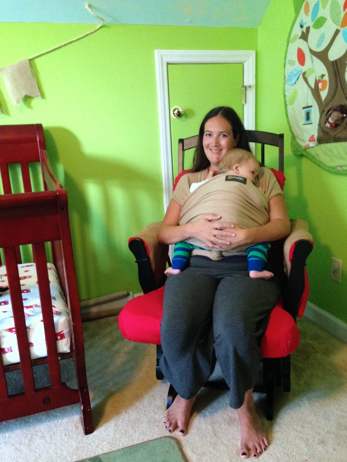 2. Baby’s bottom should be above your belly button. You’ve probably heard countless times that stretchy wraps are only good for the baby’s first several months. As long as the fabric is spread all the way to the back of your baby’s knee and your baby’s bottom is sitting above your belly button, it is tough for the baby to go anywhere. Wearing your baby higher is safer. *You can read the full article here and also see a picture of a 5 year old being worn (with no sagging) in a wrap!
