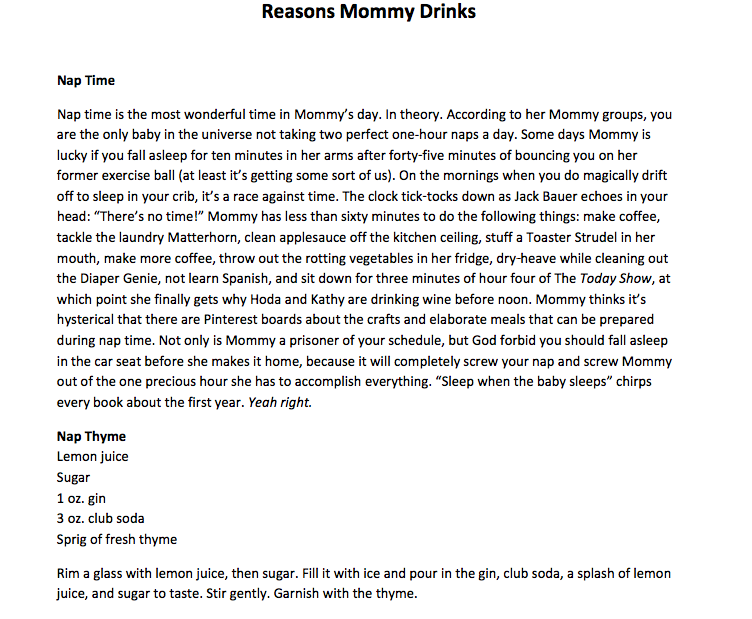 The book is written from the perspective of a nursing mom, which I truly appreciate. There are quite a few mocktails (non-alcoholic) drinks listed with the recipes. My favorite page is the She Can’t Drink page with the accompanying drink a Eighteen-Year-Old Glenlivet, “If you are going to have only one drink, make it count.”