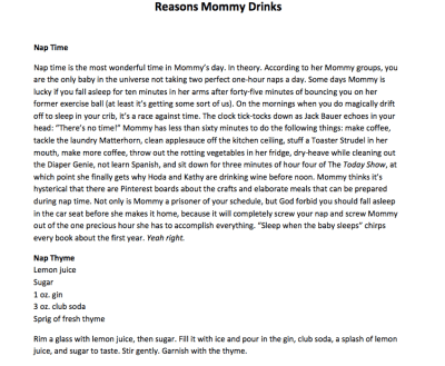 “Reasons Mommy Drinks is a fresh, insightful, and hilarious collection of the various struggles faced by new parents—from mommy groups and single-people envy to the end of maternity leave—with a well-deserved cocktail recipe to go with each one. This must-have resource will help sleep-deprived new moms survive the baby years with their sense of humor, if not their lives as they once knew them, intact.”