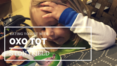 Stonyfield partnered with OXO Tot for a fun way to feed your baby or toddler delicious organic yogurt! OXO Tot sent us some great feeding products including their Easy Grip Fork & Spoon, a Divided Plate with removable ring, Twist Top Water Bottle, Flippy Snack Cup, Roll Up Bib, Baby Blocks, and Grape Cutter!