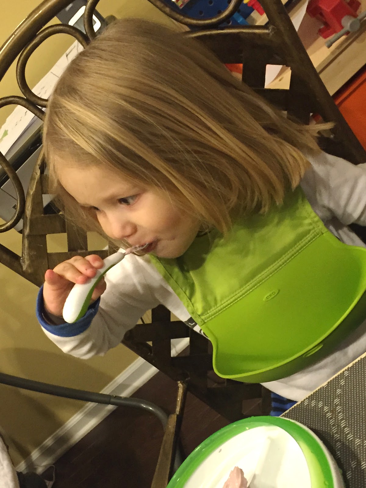 My son makes a huge mess when eating yogurt. When it drips on his shirt, he has to stop eating to go change. Sometimes he will have 3-4 outfit changes in just 1 yogurt cup. Getting him to wear a bib that he wore as a baby has been a challenge- but he was excited about the OXO Tot Roll Up Bib. Maybe it was because it was something for him instead of his baby sister!
