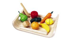 The first Eco-friendly toy I bought for Ella was the PlanToys Assorted Fruits and Vegetable cutting set.