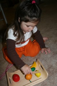 But now she is a pro. It definitely promotes fine motor skills as well as imaginative play. Ella loves to “cook dinner” and make flavored teas with the fruits. She will put them in her tea set and serve “orange tea” to all of her friends. This has been one of her favorite go to toys that she plays with every day. And I mean every day!